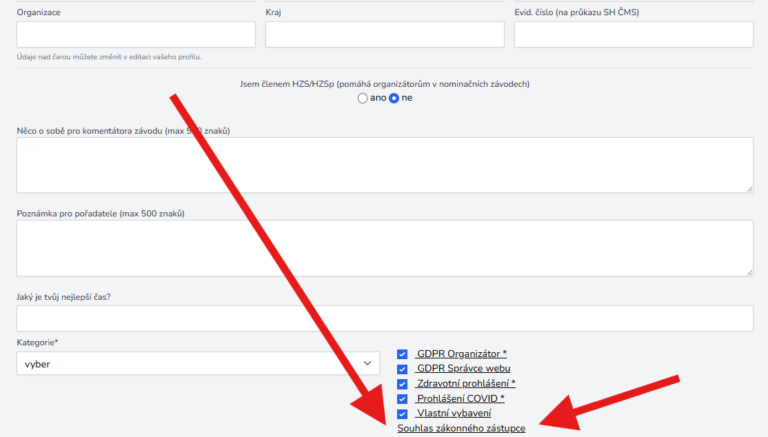 Souhlas pro závodníky mladší 18 let lze nalézt v posledním kroku přihlašování na závod mezi ostatními souhlasy. Lze ho také stáhnout zde: SOUHLAS ZÁKONNÉHO ZÁSTUPCE